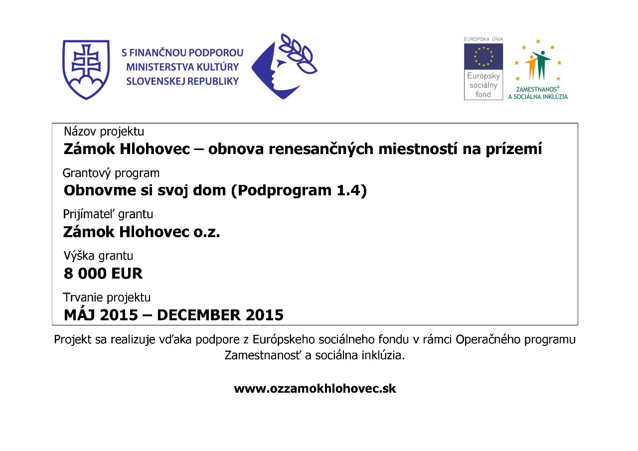 O projekte: Hlohovecký zámok bol kedysi prekvitajúcim symbolom mesta. Nanešťastie sa stal mlčiacim svedkom doby, ktorá okrem zmeny politicko-spoločenského zriadenia priniesla aj hodnotovú krízu s negatívnym dopadom na stav hlohoveckej dominanty (napriek titulu národnej kultúrnej pamiatky). V roku 2013 sa stretla skupina nadšencov, pre ktorých osud hlohoveckého zámkunebol ľahostajný. Čoskoro sa nezávislá občianska iniciatíva transformovala do podoby OZ Zámok Hlohovec. Členovia združenia a desiatky dobrovoľníkov investovali do záchrany zámku obrovské množstvo síl, vlastný čas a prostriedky. Ich úsilie prinieslo úspech vo chvíli, keď sa zámok prvýkrát po takmer dvoch dekádach otvoril pre verejnosť. Deti a rodičia, seniori, mládež, lokálna komunita aj návštevníci mesta moli počas verejných podujatí na zámku, ako napr. Stredoveké dni alebo Vianoce na zámku, spoznať jeho zákutia, vyskúšať si tvorivé dielne alebo vypočuť si koncerty lokálnych umelcov. Stovky šťastných detí a spokojných rodičov alebo starých rodičov potvrdili zmysluplnosť úsilia a správnosť cesty – zachrániť naše kultúrne dedičstvo. Cieľom projektu je zrekonštruovať miestnosť č. 107, v ktorej bude umiestnená stála expozícia venovaná bohatým dejinám tejto národnej kultúrnej pamiatky. Obnovený priestor bude prvým kontaktným bodom, ktorý umožní realizovať dlhodobý zámer sprístupniť zámok verejnosti a lokálnej komunite. Proces rekonštrukcie a revitalizácie bude prebiehať s pomocou dobrovoľníkov a stálych podporovateľov OZ Zámok Hlohovec. Všetky práce budú realizované so súhlasom Krajského pamiatkového úradu v Trnave a pod odborným dohľadom Vlastivedného múzea v Hlohovci.